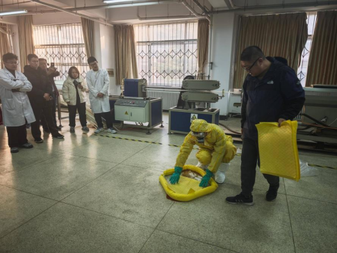 实验室管理处于忠玺就化学品泄漏事故的通用处置原则进行了说明,并对照现场展示的化学品泄漏应急套装,逐一详细讲解了套装内各类器材、工具的具体功能、操作要领及使用注意事项。